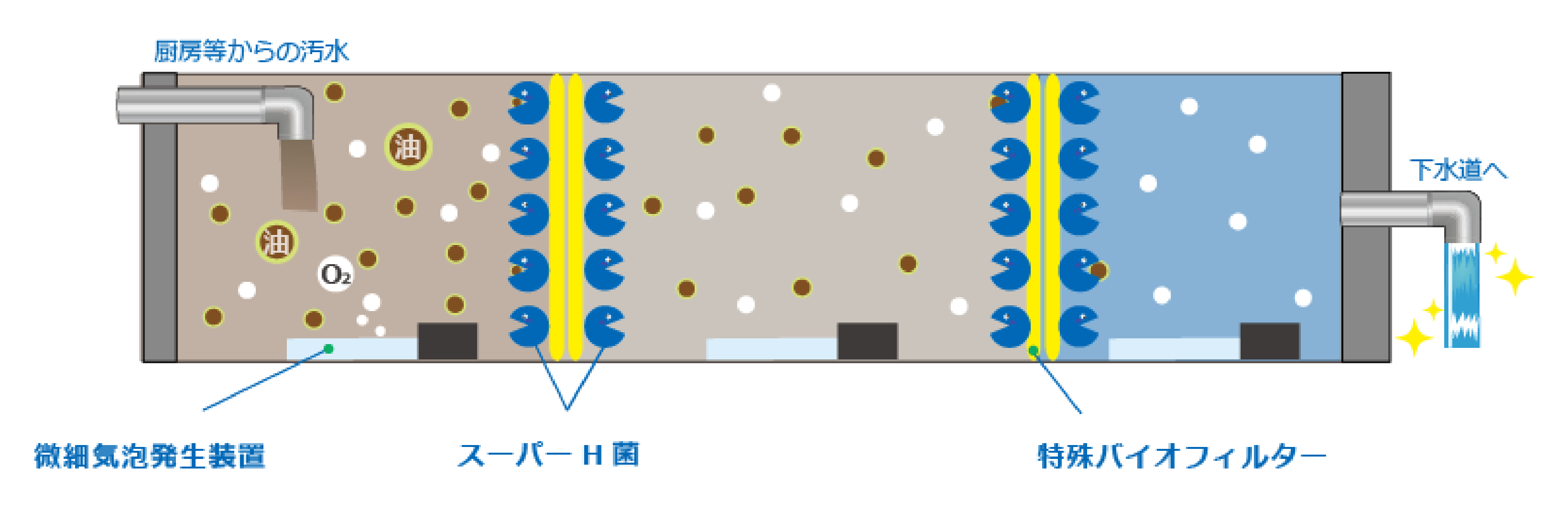 バイオ処理システムは「スーパーH菌」「特殊バイオフィルター」「微細気泡発生装置」で成り立ちます。