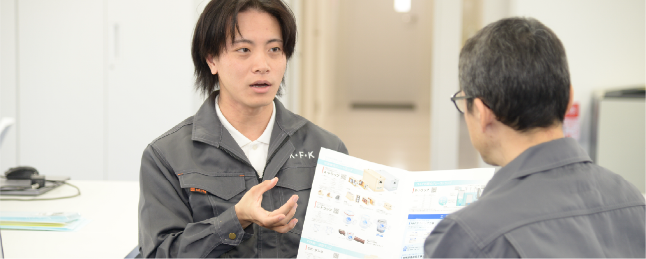 現在の仕事はバイオグリーストラップの更新工事に関しての設計を行っています。他のメンバーが行った現場調査をもとに、その場所に適切な処理状態が維持できるようにさせるのが私の役目です。基本的には社内で図面を描いていることがほとんどですが、当社ではそれ以外にも様々な仕事に挑戦することが可能です。最近ですと、当社の製品の取り扱い方法について、お客様に向けたプレゼンテーションを行いました。対面・WEB併せて100人近くのお客様の前での実施で、最初は不安でいっぱいでした。それでも先輩に前日からリハーサルに付き合っていただき、そのアドバイスのおかげで乗り切ることができました。