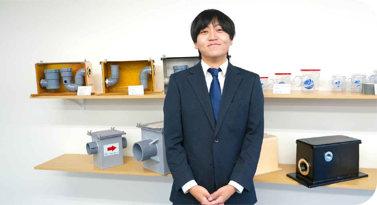 大学時代、趣味で友人とデニムにオリジナル加工を施し販売していた経験があり、ニッチな製品を自分たちの工夫で届けていく面白さに魅力を感じてました。それに加え、もともと人と話すことが好きという性格を活かし、“知名度の高くない製品を自分の力で広めていきたい″という思いが就職活動の軸でした。その軸で就職活動を進めていた中で出会ったのが、当社です。当社の製品は、普段目に触れる機会こそ少ないものの、人の生活を支える非常に重要な存在であり、まさに「ニッチだが価値の高い製品」だと考えています。だからこそ、自分自身の能力を最大限発揮できる環境だと思い、志望しました。今でもその気持ちは変わらず、「ニッチだが価値の高い製品」を自分たちの工夫で届けていく面白さにやりがいを感じています。